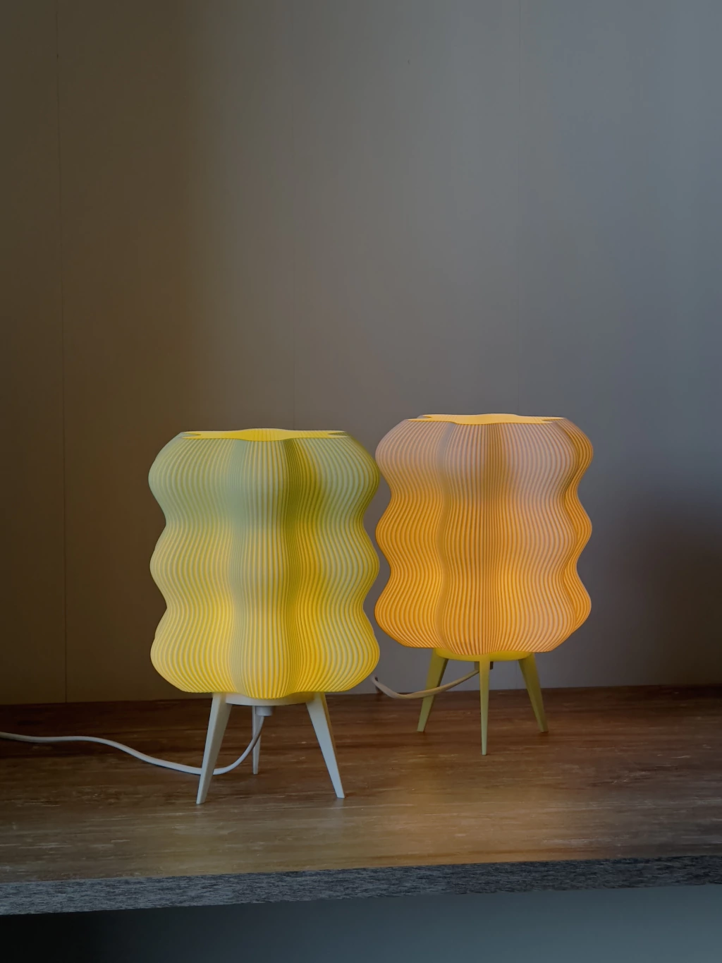 Iluminá tus espacios con una pieza única de diseño contemporáneo. Esta lámpara está impresa en 3D con materiales sustentables y presenta una textura ondulada que genera un efecto visual cálido y elegante, tanto apagada como encendida.